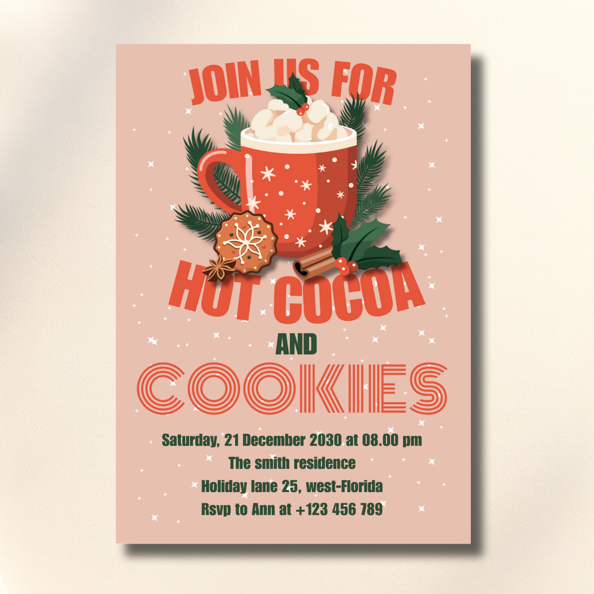 Create a warm and festive atmosphere with the Hot Cocoa Red Mug & Cookies Holidays Canva Event Set template. Featuring a cozy holiday design inspired by classic red mugs and sweet seasonal treats, this template is perfect for hosting Christmas gatherings, cocoa bars, cookie exchanges, school events, or winter celebrations.
